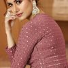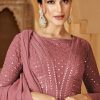 Rose Pink Front Slit Georgette Pant Suit, made with resham work and motifs and foil mirror work on the kameez. This product comes with top (with bra cups) bottom trouser & dupatta.