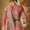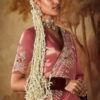 Rose pink kanjivaram silk wedding saree, designed with minakari, zari work enhanced by stone embroidery and tassels. The saree comes with a contrast green matching blouse.