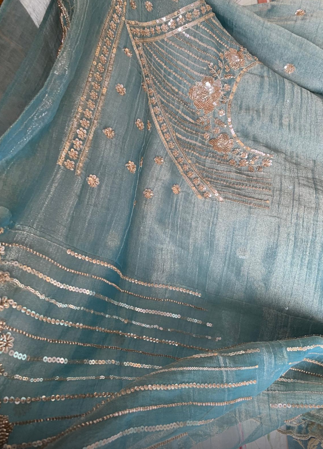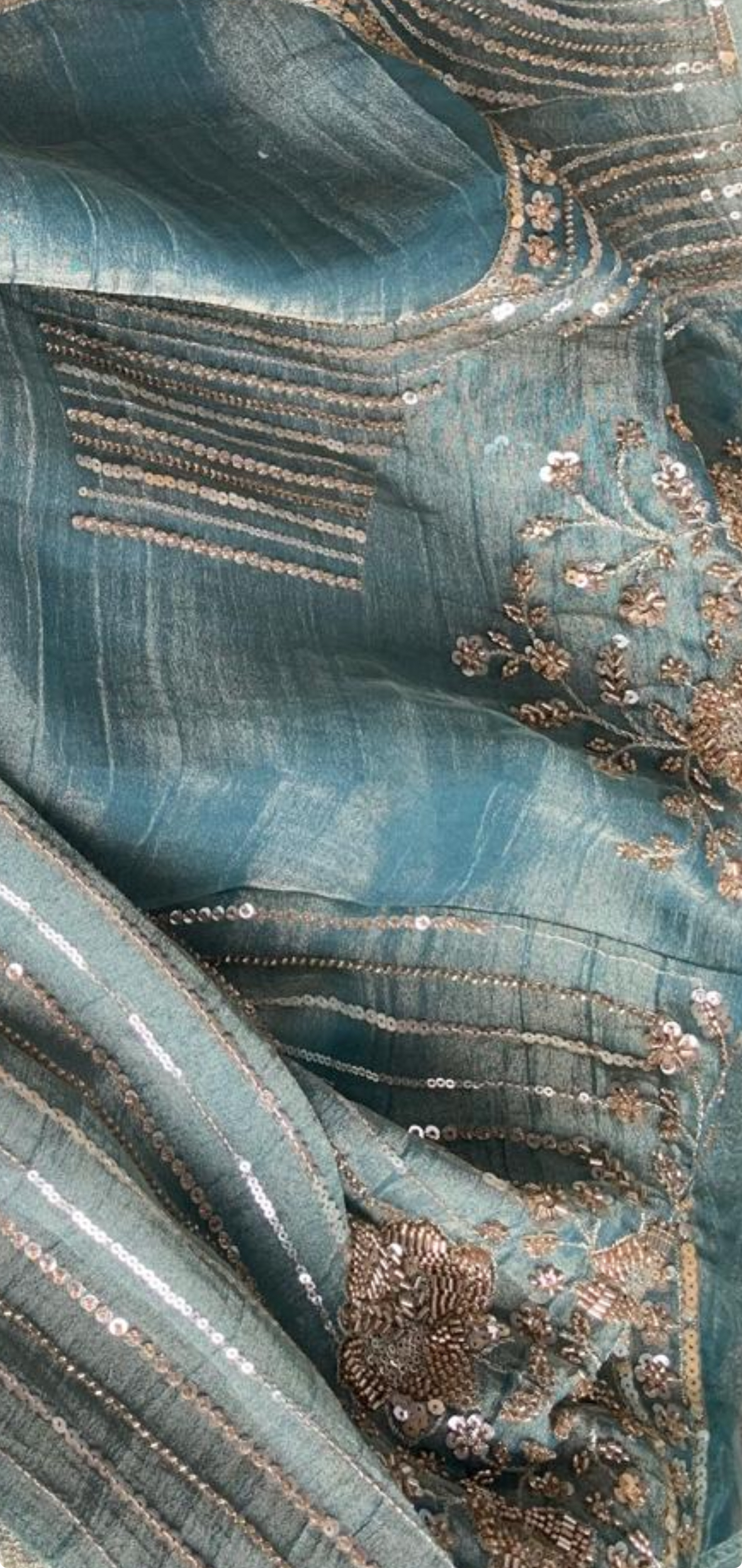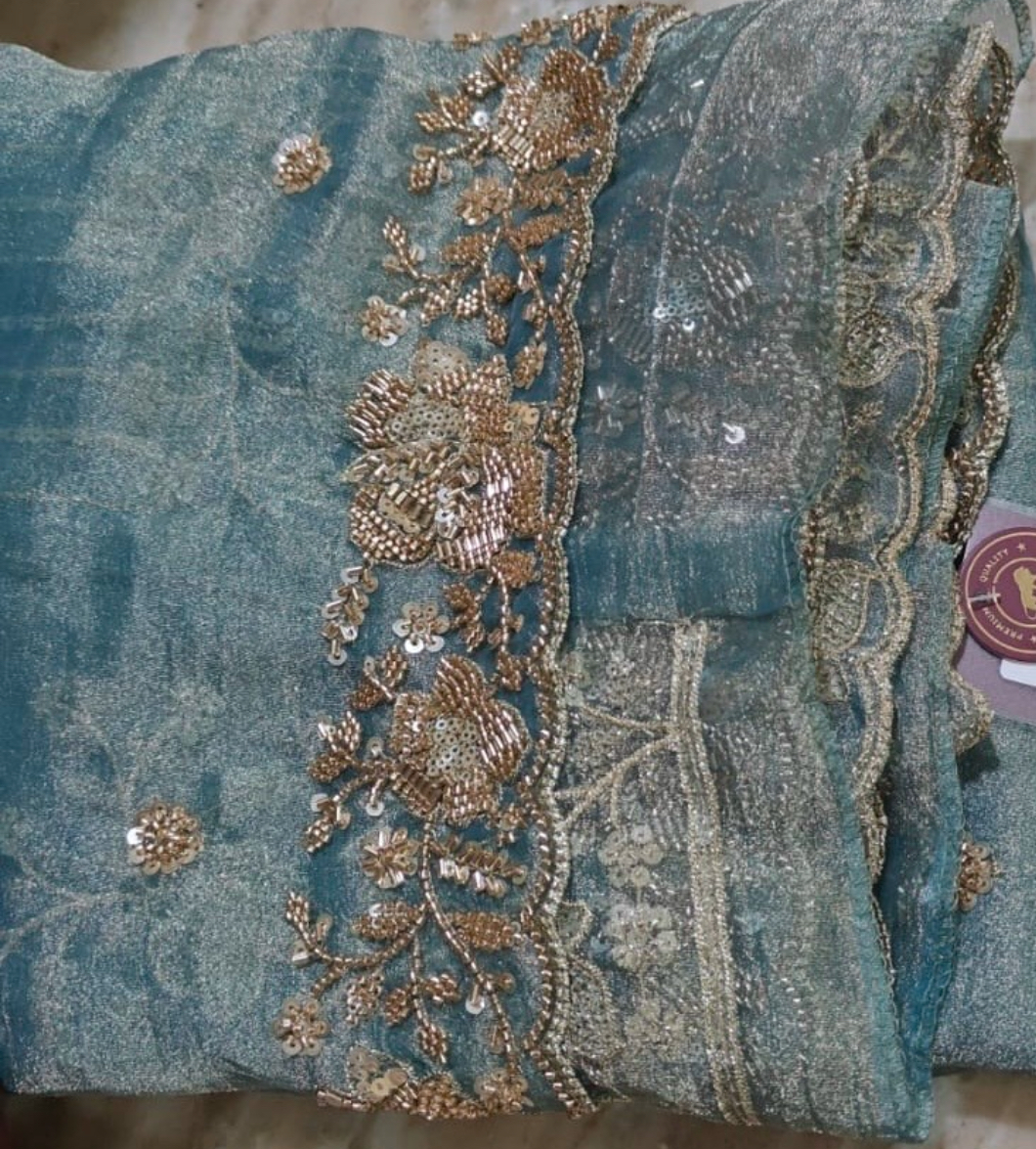 Sage blue green embroidered shimmer wedding saree, embellished with sequin zardosi stone and thread work. The saree comes with a matching contrast blouse.