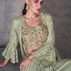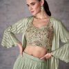 Sage green indo western palazzo suit & crop top, made with sequence and thread embroidered work. Comes with a matching crop top, jacket & palazzo. Does not come with dupatta.