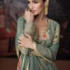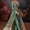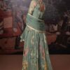 Sage green side slit embroidered anarkali Suit, made with thread zari sequin work. Comes with top, trouser and a net dupatta.