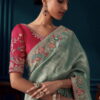 Sea green pure silk wedding saree, designed with thread, zari work enhanced by fancy lace border. The saree comes with a contrast matching blouse.
