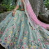 Sea green silk bridal lehenga choli, designed with sequin, zari work, hand embroidered paired with matching embroidered blouse and silk dupatta.