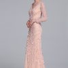 Sheer Light Pink Sequin Luxury Long Evening Gown is beautifully weaved together with Beading,Crystal,Sequined work patterns all over the dress with bra padded .