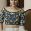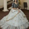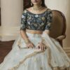 Sky blue embroidered net party wear lehenga choli made with thread & sequins work. Comes with matching navy blue choli and sky blue dupatta.