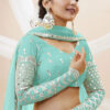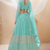 Sky blue georgette embellished lehenga choli, designed with sequin zari and foil mirror work. Paired with matching blouse and dupatta.