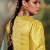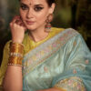 Sky blue tissue silk wedding saree, designed with thread, zari work enhanced by stone embroidery. The saree comes with a contrast yellow matching blouse.