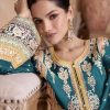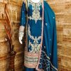 Teal embroidered chinon palazzo pant suit made with thread zari work. Comes with matching top, bottom and dupatta.