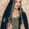 Teal velvet embroidered pant suit, made with resham & thread sequin work. Includes top bottom and a dupatta.