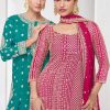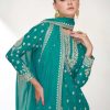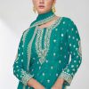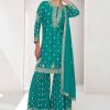 Turquoise chinon silk embroidered sharara suit, made with thread zari and sequin work. Comes with matching top, bottom and dupatta.