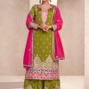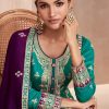Turquoise embroidered silk palazzo suit made with thread zari work. Comes with matching top, bottom and dupatta.