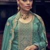 Turquoise embroidered textured silk palazzo suit with resham work and patch border with touch up patterns on the yoke and lower part of the kameez.