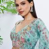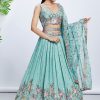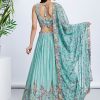 Turquoise floral sequinned wedding lehenga Choli in chiffon silk delicately made with, thread, sequin, stone and diamond work. Comes with a matching choli and dupatta.