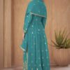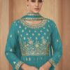 Turquoise georgette embroidered anarkali palazzo suit made with thread zari sequin work. Comes with matching top, bottom and dupatta.