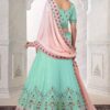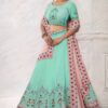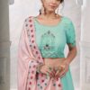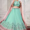 Turquoise georgette embroidered bridal lehenga choli, made with thread and stone work. Comes with matching organza silk lehenga, choli and net dupatta.