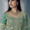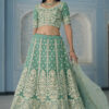 Turquoise organza Sangeet Lehenga Choli, designed with floral print, sequin, zari work embroidered paired with matching embroidered blouse and dupatta.