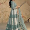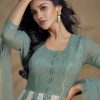 Turquoise sequin thread Anarkali gown, made with sequence and embroidered work. Comes with matching top and net dupatta. Does not come with trouser.