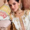 White embroidered chinon palazzo pant suit made with thread zari work. Comes with matching top, bottom and dupatta.