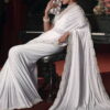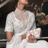 White heavy embellished bridal party saree designed with anll over crystal, moti, mirror and cut dana work. The saree comes with a matching art silk blouse.