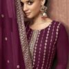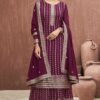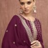Wine georgette embroidered palazzo pant suit made with thread zari work. Comes with matching top, bottom and dupatta.
