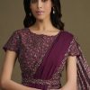 Wine silk pre-pleated designer saree crafted with sequin and thread embroidery work. The saree comes with pre pleated saree only an and a unstitched matching raw silk blouse. Belt not included.