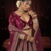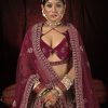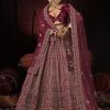 Wine velvet embroidered bridal lehenga choli, delicately crafted with, sequin, stone and diamonds. Comes with a matching soft velvet lehenga, choli and net dupatta.