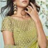 Yellow crepe chiffon designer saree crafted with sequin and cord embroidery work. The saree comes with a unstitched matching soft taffeta blouse.
