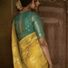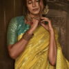 Yellow dola silk wedding saree, designed with thread, zari work enhanced by fancy lace border. The saree comes with a contrast matching blouse.