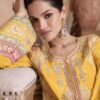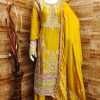 Yellow embroidered chinon palazzo pant suit made with thread zari work. Comes with matching top, bottom and dupatta.
