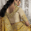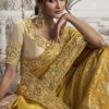 Yellow fancy silk wedding reception wear saree made with intricate embroidery border work. The saree comes with a matching blouse.