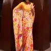 Yellow floral print satin crepe saree crafted with all over print design. The saree comes with a matching unstitched blouse.