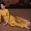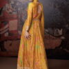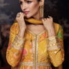 Yellow front slit embroidered anarkali suit, made with thread zari sequin work. Comes with top, trouser and a net dupatta.