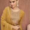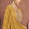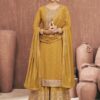 Yellow georgette embroidered palazzo pant suit made with thread zari work. Comes with matching top, bottom and dupatta.