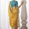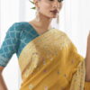 Yellow kora silk wedding saree, designed with minakari, zari work enhanced by stone embroidery and tassels. The saree comes with a contrast green matching blouse.