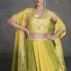 Yellow lehenga suit with shrug, made with thread zari, and sequin work. Comes with matching top, bottom and jacket.