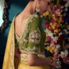 Yellow pure silk wedding saree, designed with thread, zari work enhanced by fancy lace border. The saree comes with a contrast matching blouse.