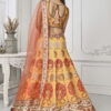 Yellow satin silk wedding lehenga choli designed with digital print and intricate swarovski crystals on the lehenga. The outfit comes with a lehenga, choli and a soft net dupatta.